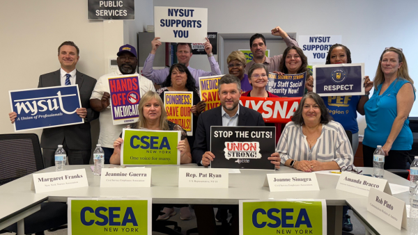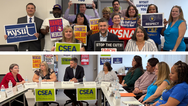 CWA Local 1120 members joined representatives from 1199 SEIU, the New York State Nurses Association (NYSNA), the Public Employees Federation (PEF), the New York State United Teachers (NYSUT), the Hudson Valley Area Labor Federation, and other unions on SEptember 23rd for a roundtable discussion with Congressman Pat Ryan on the so-called “One Big Beautiful Bill Act. The discussion focused on the harmful impact of the bill on the Hudson Valley’s working families, and how Rep. Ryan can work with area unions to prepare for the impact of federal funding cuts and fight back.