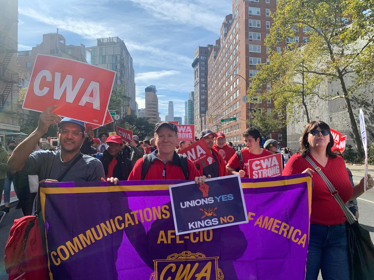 In New York City, thousands of union members marched from Duarte Square in Lower Manhattan, led by banners from CWA members along with teachers, transit workers, nurses, building trades locals, and more. Our message was clear: in this country, we don’t have kings, we won’t back down against chaos and corruption, and we demand an economy that serves people — not just the powerful few.