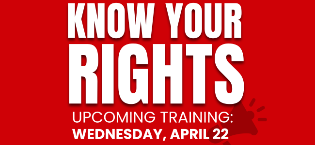 Join us for our next virtual "Know Your Rights" training (conducted over Zoom) on Wednesday, April 22, at 7pm to hear from lawyers from the AFL-CIO, covering constitutional rights in and out of the workplace and how they apply to immigration enforcement, protesting and other acts of civil resistance.